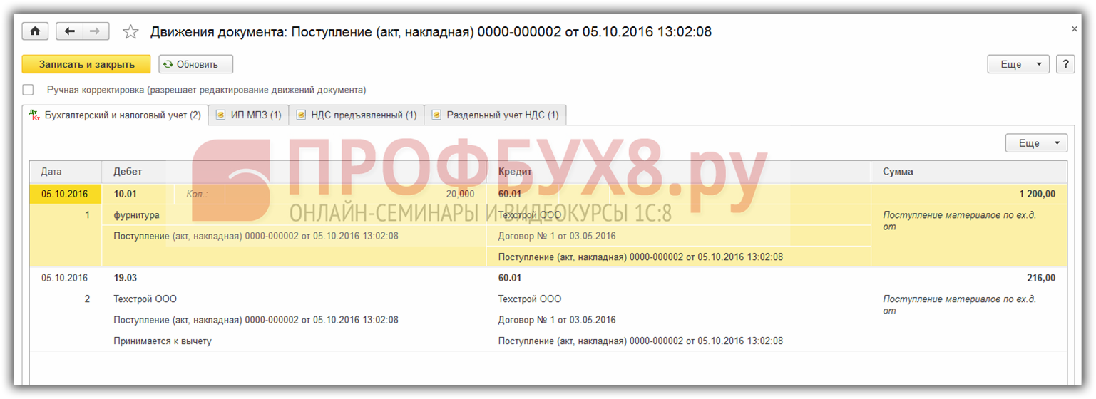 Проведем его и посмотрим, какие проводки документ поступления сформировал в 1С 8.3: