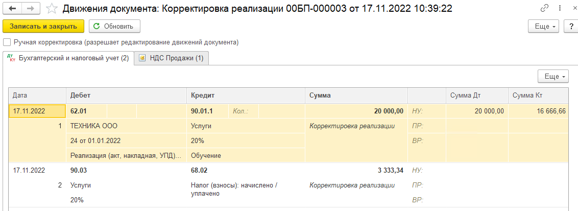 После проведения документа в программе формируются проводки с применением специальных счетов исправления ошибок согласно выбранному периоду.