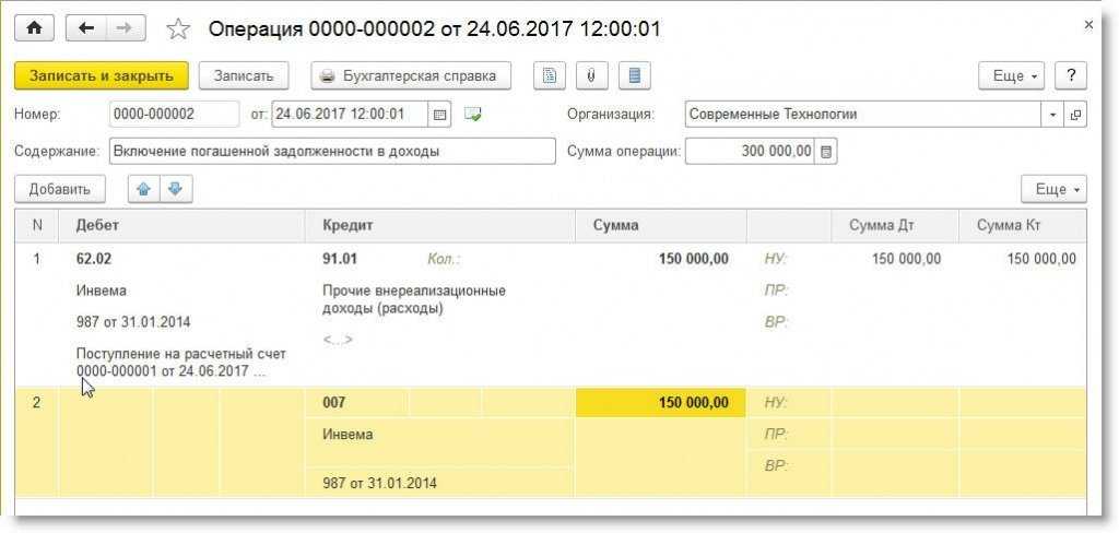 Сумму погашенной задолженности необходимо включить в состав прочих доходов организации, а также списать с забалансового счета 007. Указанные операции можно отразить в одном документе Операция