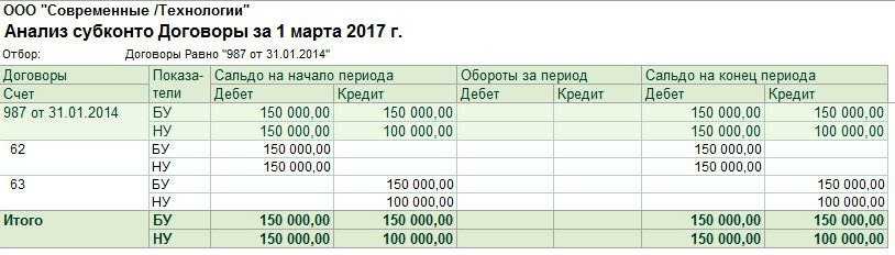 Сформированный отчет позволяет проанализировать данные бухгалтерского и налогового учета по выбранному договору на момент истечения срока исковой давности с детализацией по счетам (рис. 1).