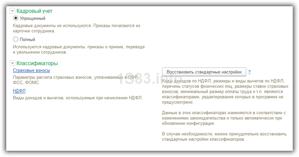 Для полноты примера отметим, что учет зарплаты и кадровый учет будут вестись в данной программе. Конечно же здесь есть свои ограничения, но если в штате вашей организации работает не много сотрудников, то функционала 1С:Бухгалтерия будет вполне достаточно.