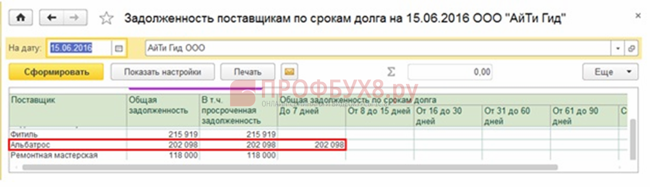 Из отчета видим, что по состоянию на 15.06.2016 имеется неоплаченная задолженность поставщику сроком до 7 дней в размере 202 098.00 руб: