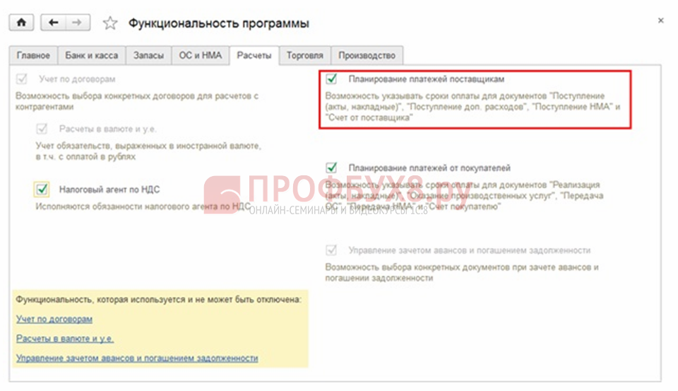 Переходим в раздел Главное – Настройки – Функциональность. На закладке «Расчеты» ставим флажок «Планирование платежей поставщикам»: