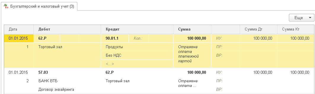Ситуация. Мы розничный магазин с торговым залом. 1 января выручка по платёжным картам составила 100 000 рублей. 2 января наш банк-эквайер перечислил эту сумму на наш расчётный счёт. За услуги эквайринга банк взял 1% от суммы.