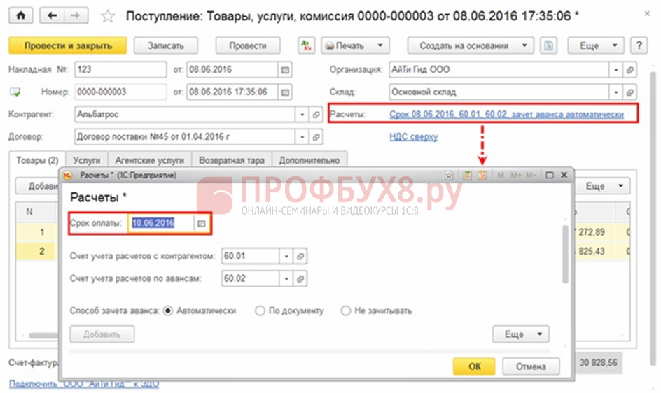 Проведем его и посмотрим, какие проводки документ поступления сформировал в 1С 8.3: