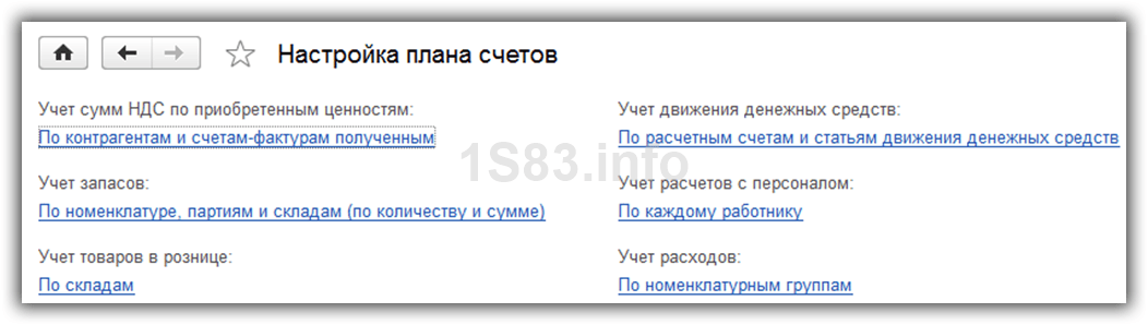 Для перехода к данному пакету настроек, необходимо перейти по одноименной гиперссылке в форме параметров учета. Многие настройки здесь следует оставить по умолчанию, но все равно у вас есть обширное поле для действий.