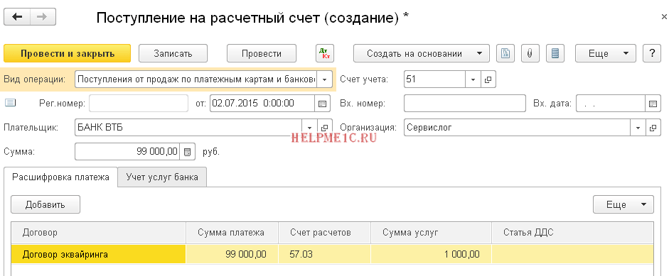51 (наш расчетный счет) 57.03 (переводы в пути) 99 000 (оплата за вычетом комиссии зачислена на наш счет)