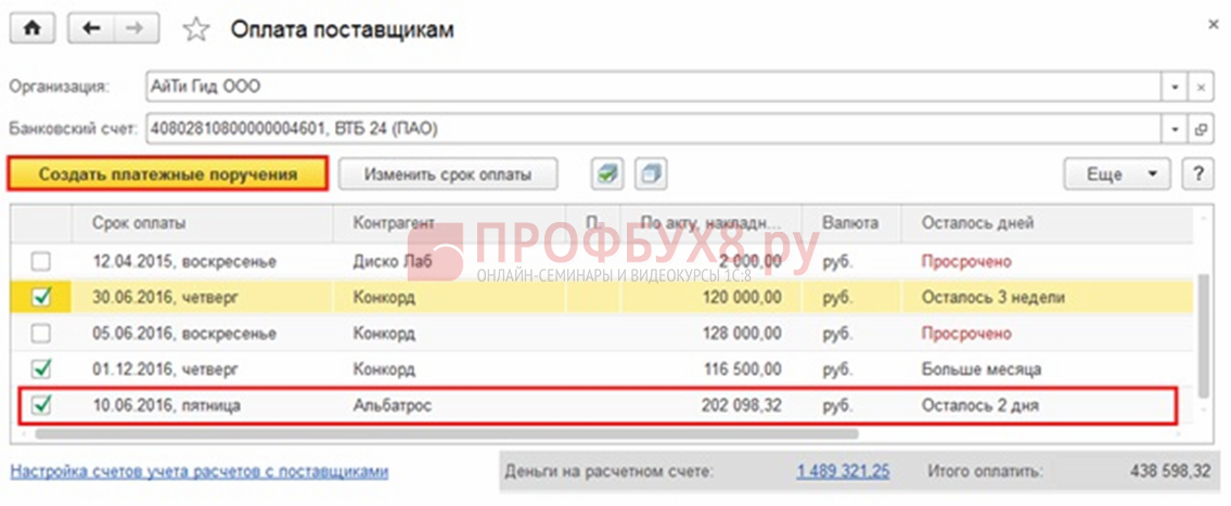 Если указать сразу несколько задолженностей одному поставщику, то помощник сформирует один документ «Платежное поручение» на всю сумму задолженности.