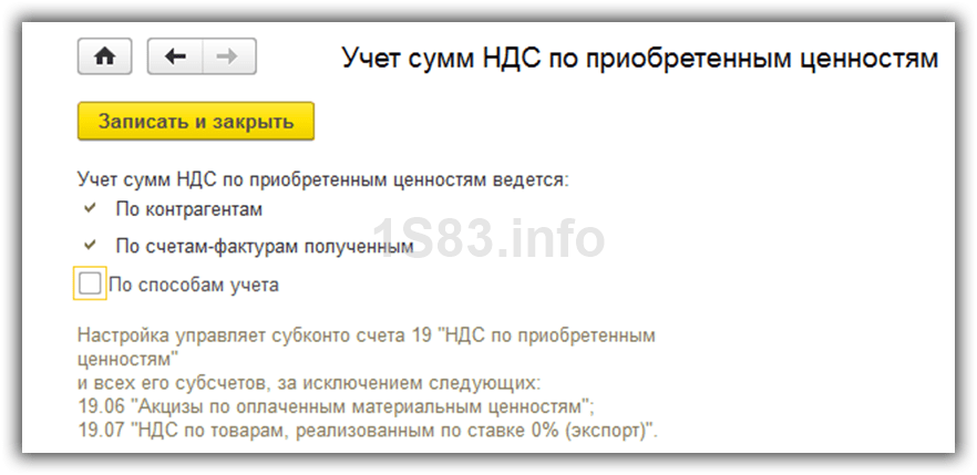 По умолчанию указаны способы учета – по полученным счетам-фактурам и по контрагентам. Эти параметры являются предопределенными, их нельзя отключить. Кроме того, можно включить «По способам учета». Настройка управляет субконто бухгалтерского счета 19.