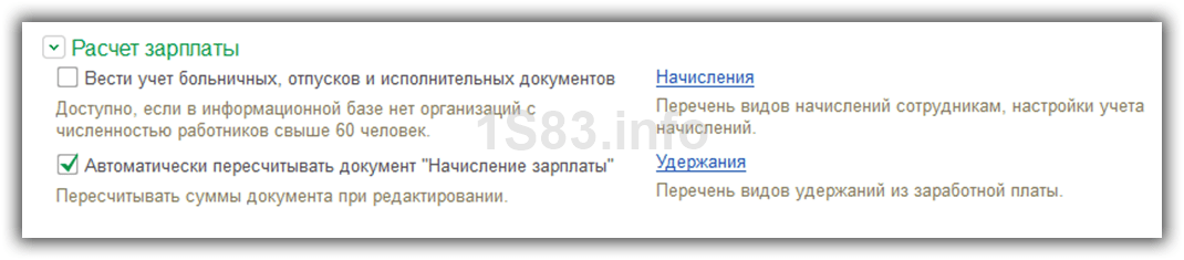Так же, в данном разделе 1С можно включить доступность функционала больничных, отпусков и исполнительных документов. Настройка доступна только если в базе отсутствуют организации, где работает больше 60 человек.