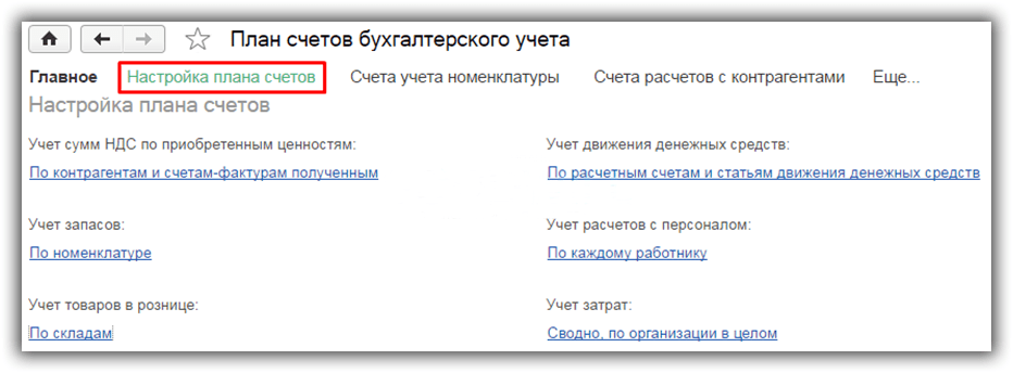 Данный раздел настроек состоит из шести пунктов. Далее мы рассмотрим каждый из них. Все они позволяют влиять на состав субконто у определенных счетов и субсчетов.