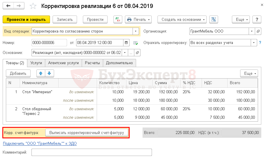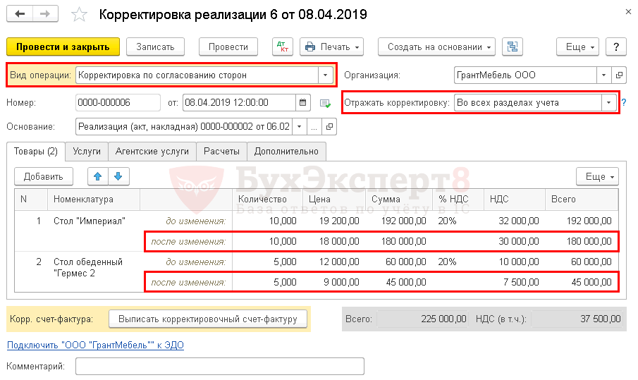 Выставление продавцом корректировочного документа в программе вводится на основании документа Корректировка реализации с видом операции Корректировка по согласованию сторон. Корректировочный счет-фактура отражается отдельным документом. Кроме этого, в программе предусмотрена возможность повторной корректировки первичных документов и счетов-фактур.