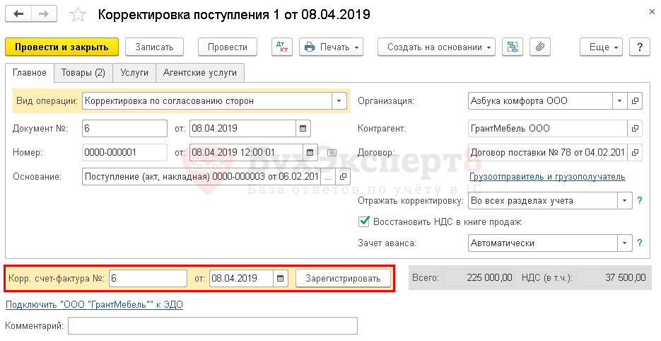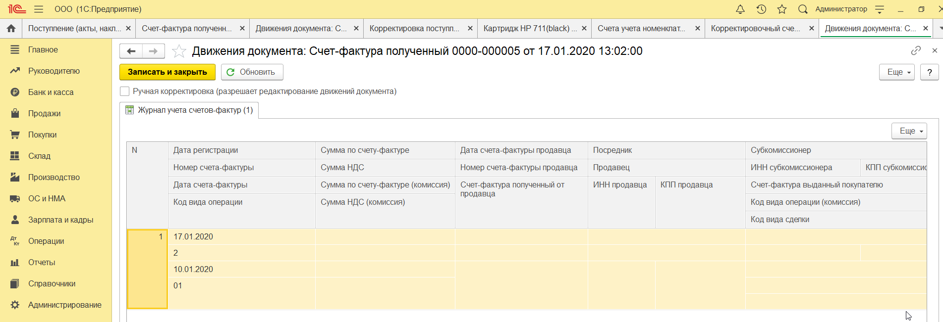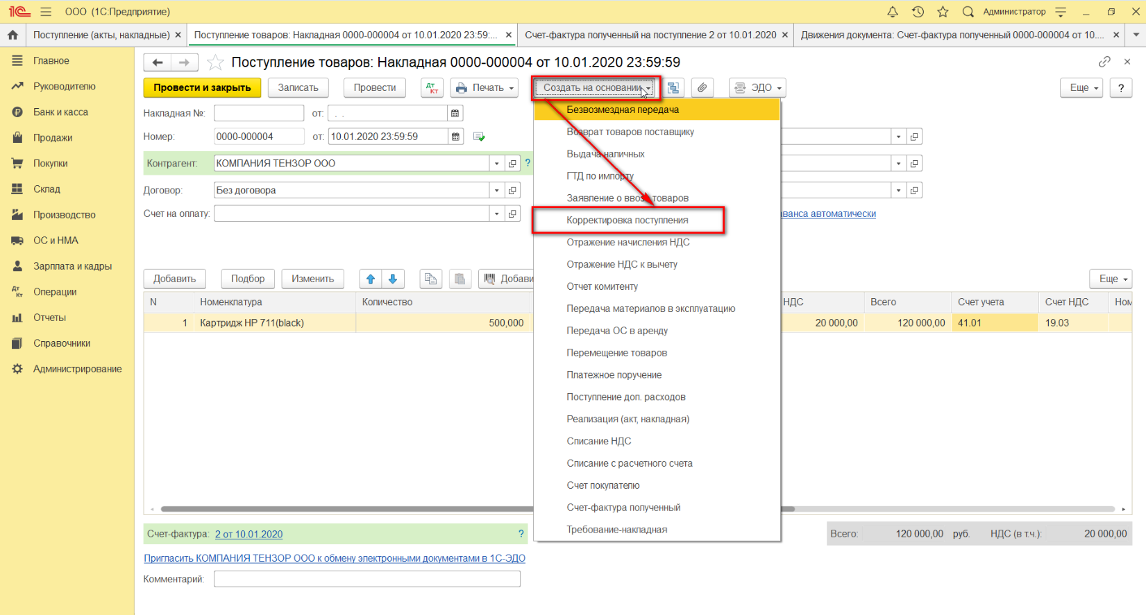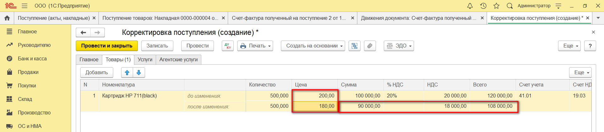 Рассмотрим, как внести корректировочный счет-фактуру в 1С 8.3 от поставщика на примере.