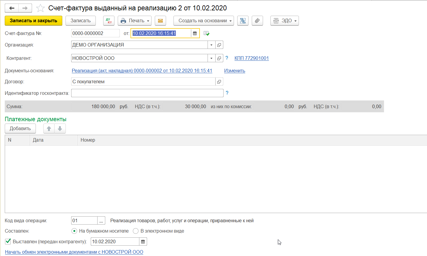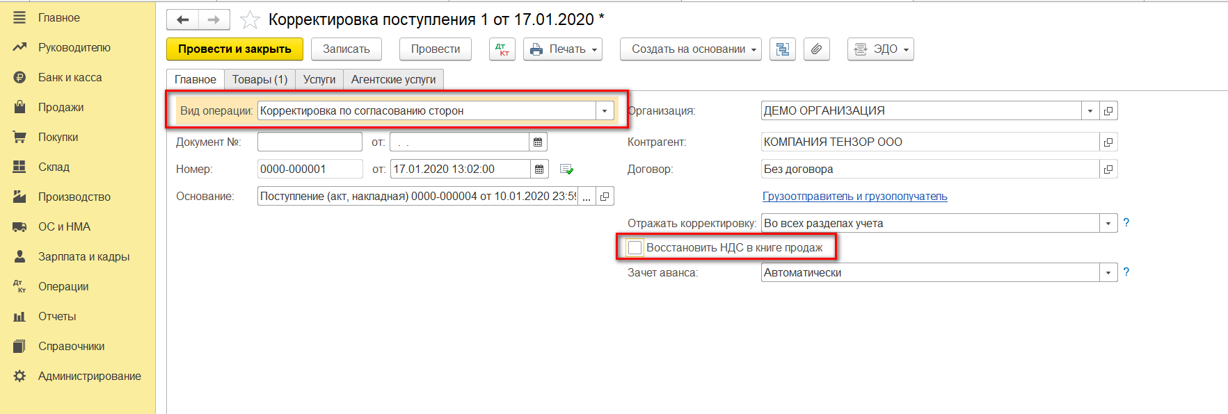- флажок Восстанавливать НДС в книге продаж установите, если ранее НДС по поставке был принят к вычету.