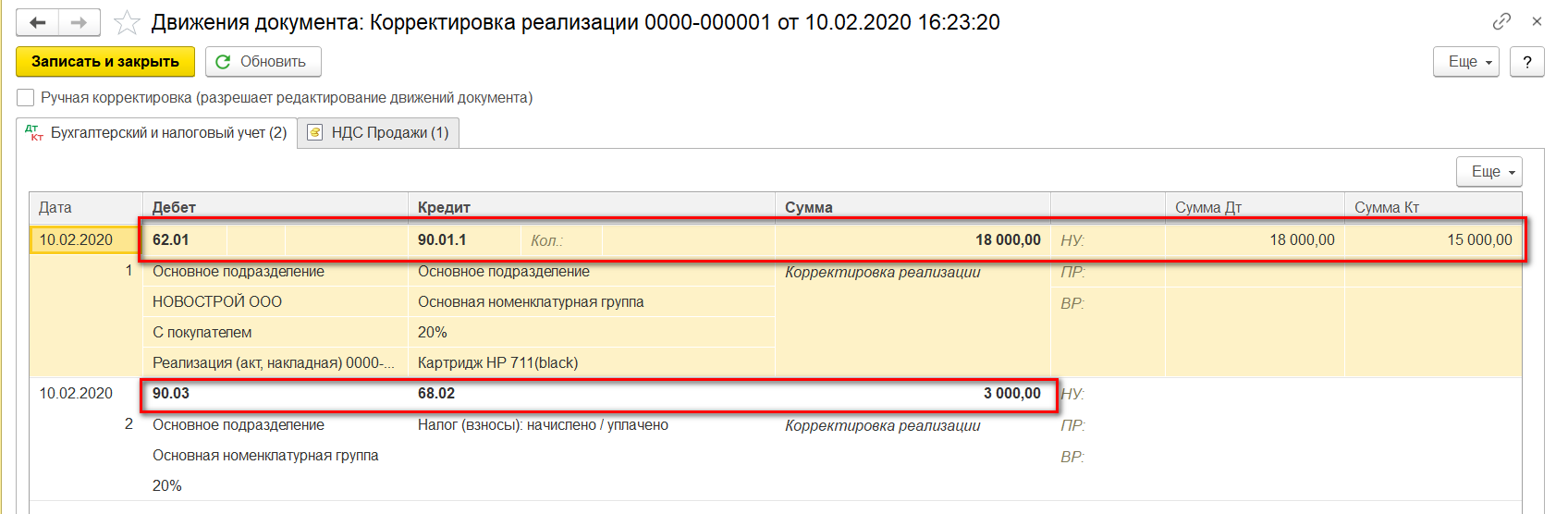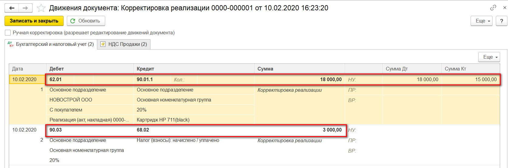 В результате проведения документа Корректировка реализации формируются следующие бухгалтерские проводки: