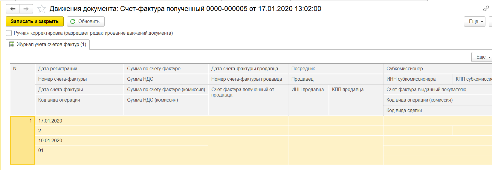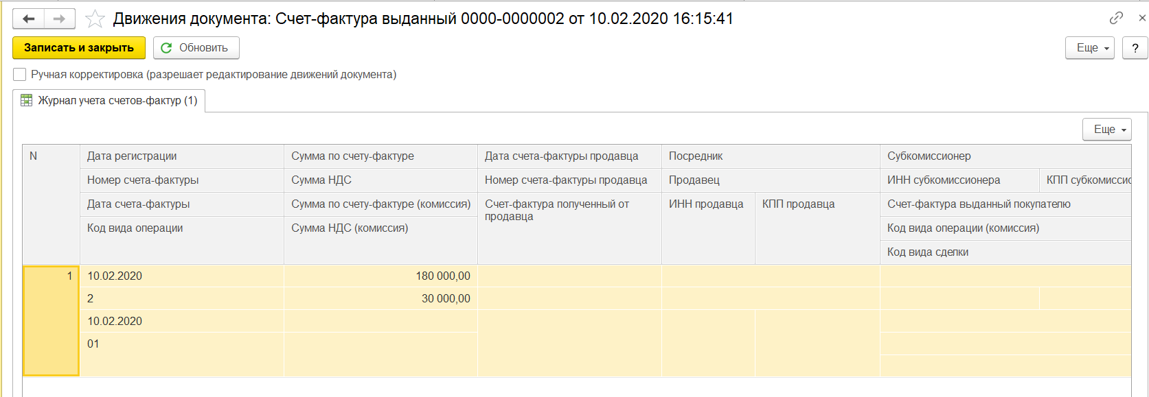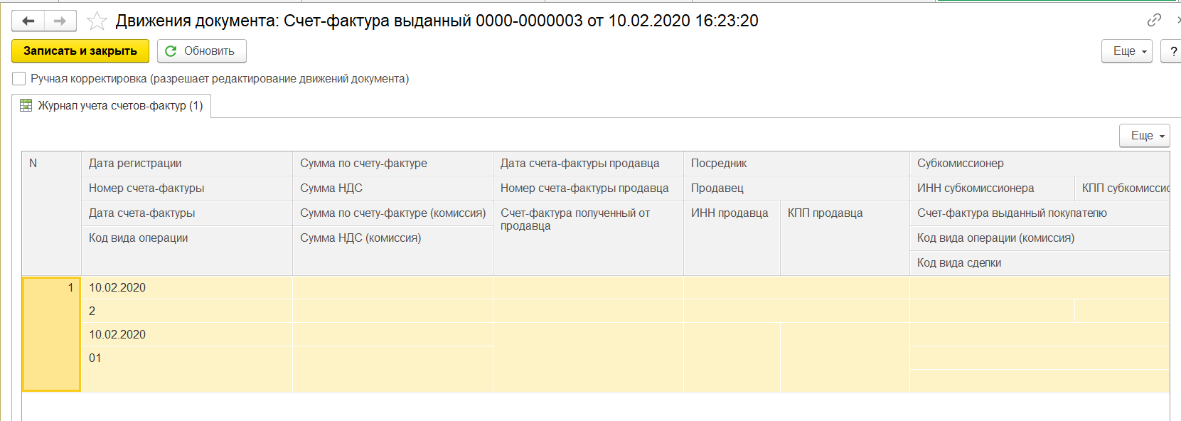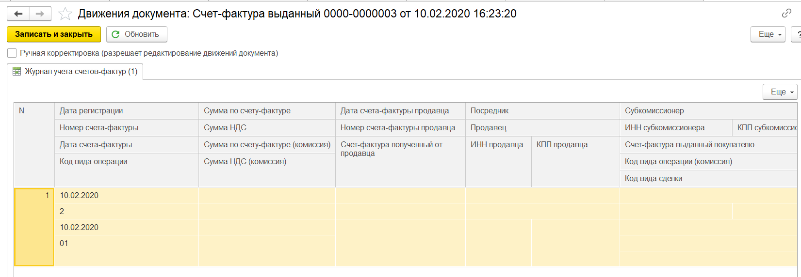 После проведения документа Счет-фактура выданный на реализацию исправленный будет внесена запись в регистр сведений Журнал учета счетов-фактур с признаком Исправление.