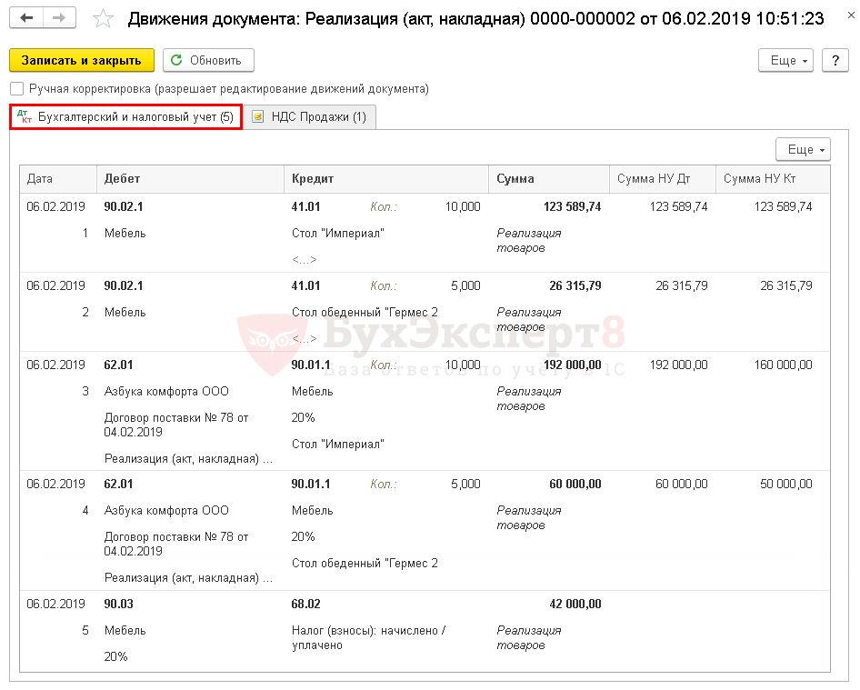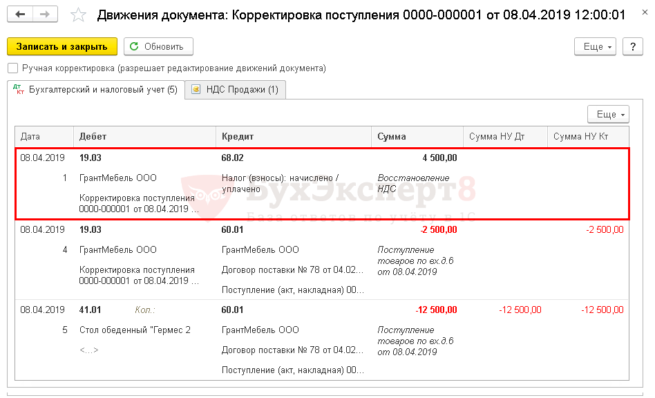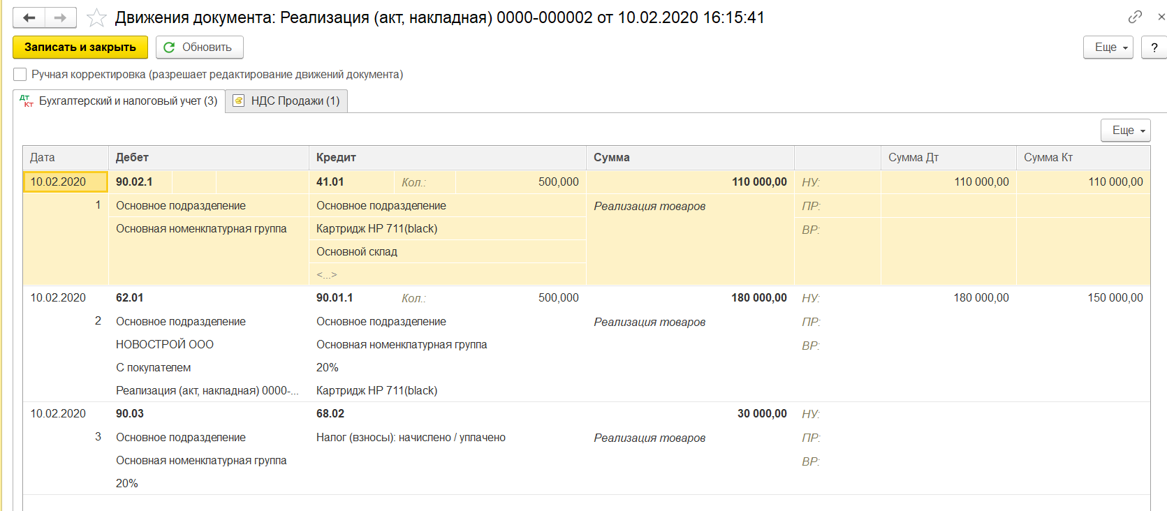 В регистр накопления НДС продажи, отражающего начисление НДС в бюджет, одновременно вводятся две записи: