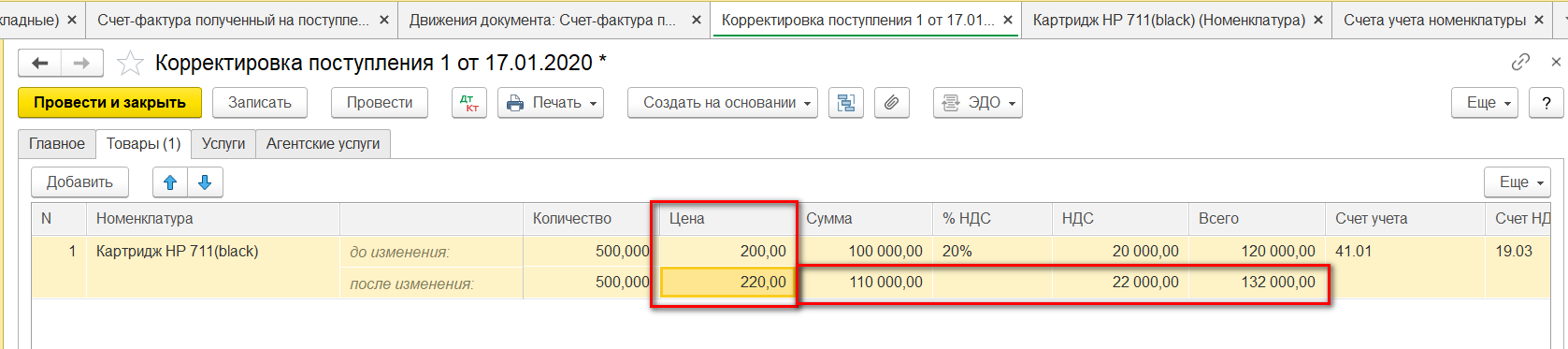 Заполняем табличную часть вкладки «Товары». Увеличиваем цену, остальные суммы пересчитаются автоматически.