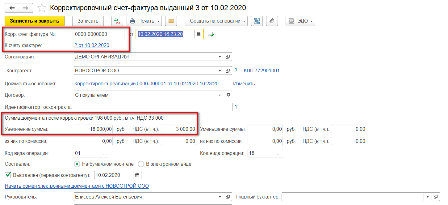 Следующий вариант корректировки – продавец увеличил стоимость. Алгоритм во многом схож, КСФ отражаем в книге продаж.