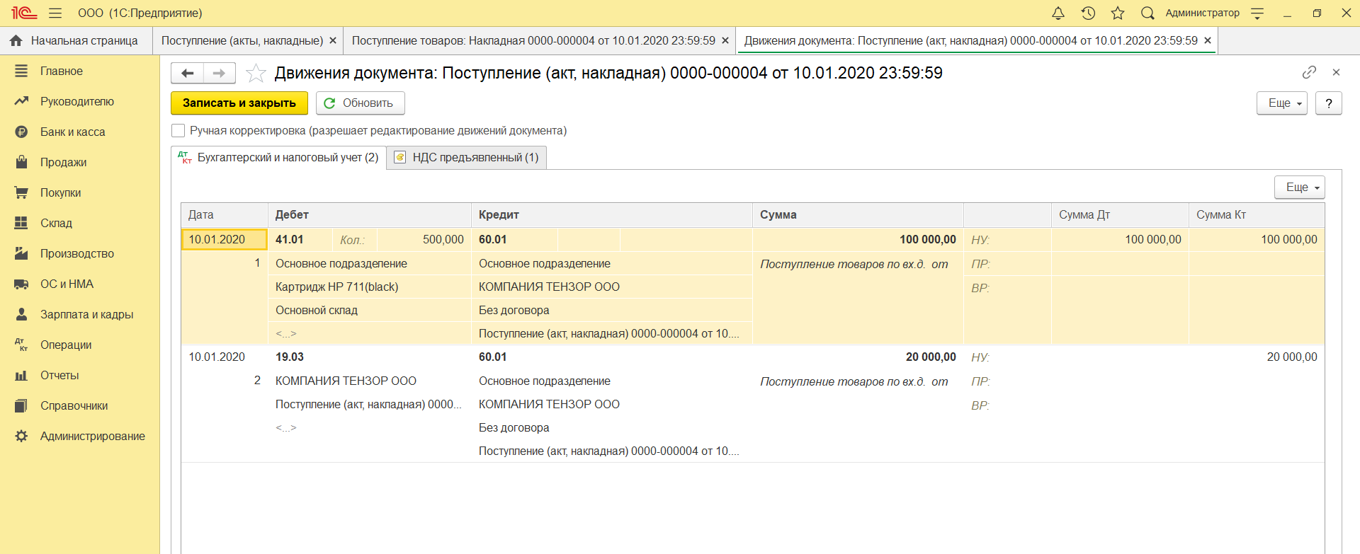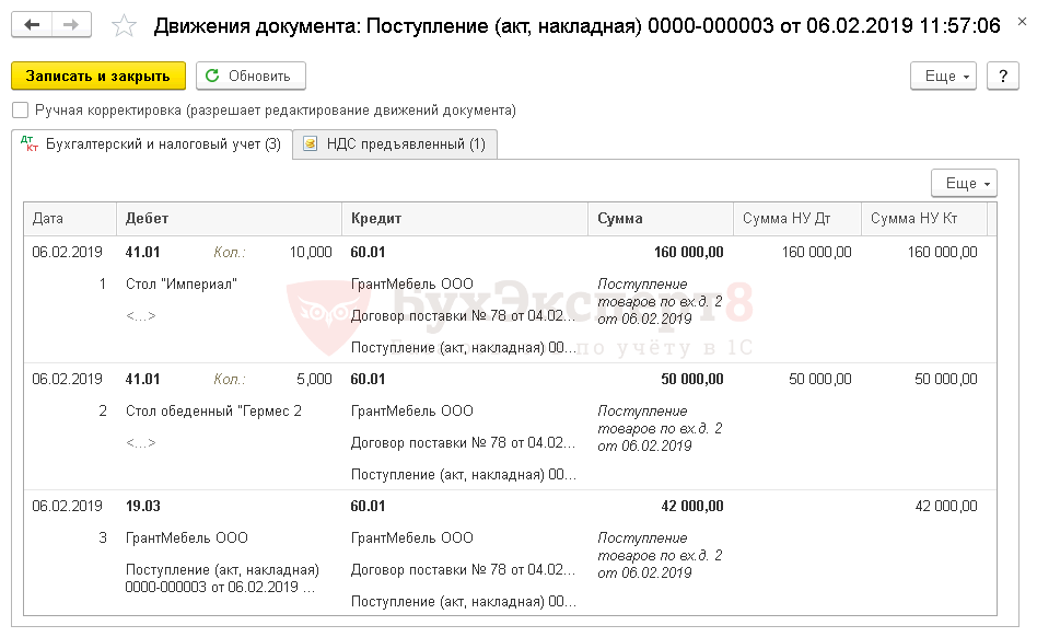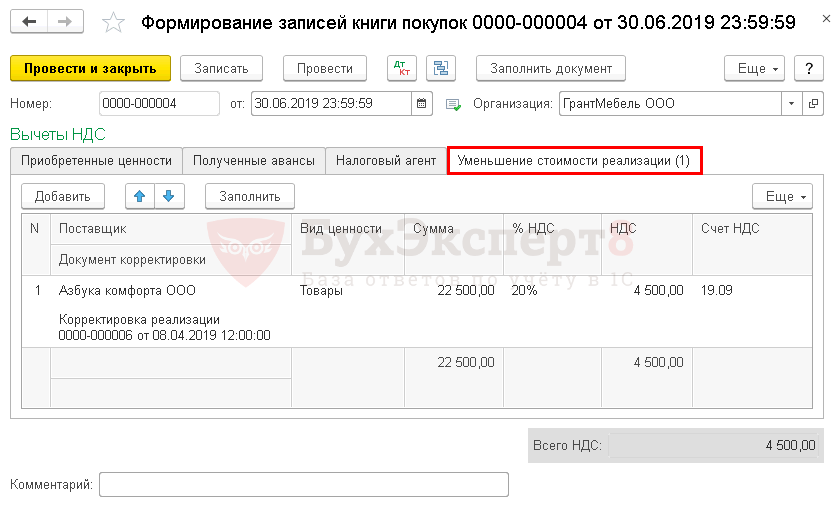 В документе формируются проводки и записи по регистрам НДС, на основании которых можем сформировать книгу покупок.