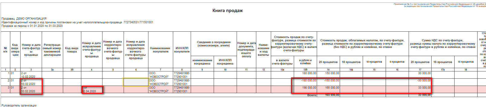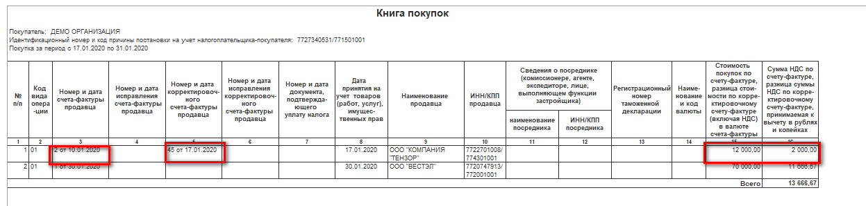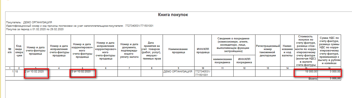 Проводим документ и формируем Книгу покупок. В ней отражается первичный счет-фактура, следующей строчкой он же только с минусовой суммой (сторно), далее корректировочный счет-фактура. Все отразилось в одной книге без доплистов.