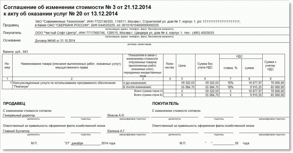 В отличие от ситуации с обнаруженной ошибкой корректировка стоимости выполняется по согласованию сторон. При этом составляется дополнительное соглашение к договору (если возможность корректировки условий заранее не оговорена в договоре), уведомление об изменении стоимости, протокол согласования цены или иной аналогичный документ, регистрирующий новый факт хозяйственной жизни, но первичные учетные документы (товарные накладные или акты) на отгруженные товары (работы, услуги, права) не изменяются.