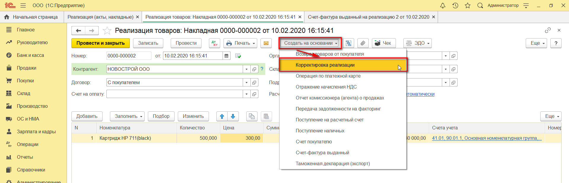 Рис. 1. Корректировка реализации – исправление в первичных документах