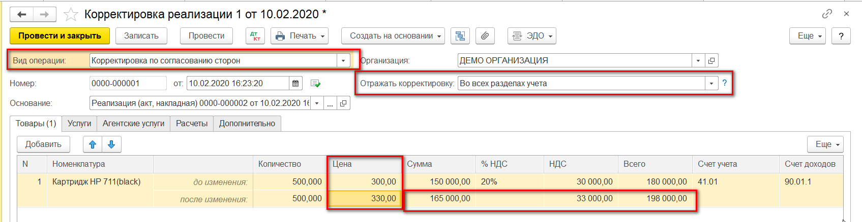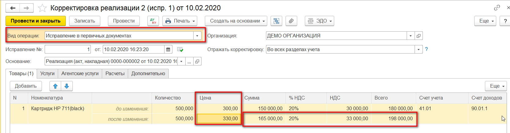 - Отражать корректировку — Во всех разделах учета, т. к. изменение стоимости отражается не только по НДС, но также в БУ и НУ;