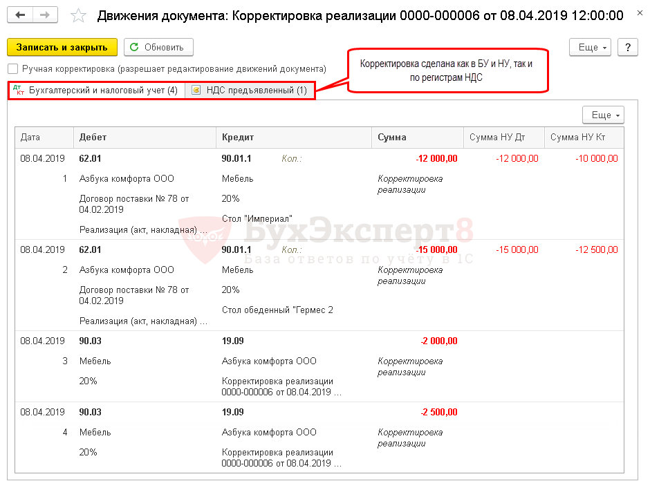 На вкладке «Главное» оставляем установку «Восстановить НДС в книге продаж». Кроме того, можем по ситуации менять варианты, где отражать корректировку – во всех разделах учета или только по НДС. Мы выбрали первый вариант, тогда формируются бухгалтерские проводки.
