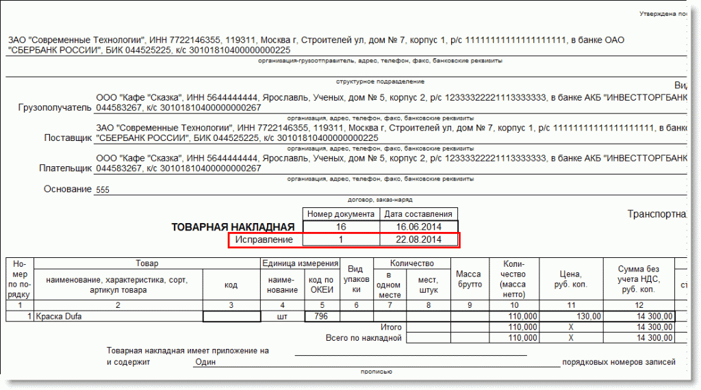 В программе «1С:Бухгалтерия 8» (ред. 3.0) поддерживается методика внесения исправлений путем выставления нового исправленного варианта первичного документа. Для обеспечения этой методики внесение исправления отражается в дополнительных полях первичного документа (товарной накладной ТОРГ-12, акта об оказании услуг): Исправление № и от. В данных полях указывается номер и дата исправления по аналогии с исправлением счета-фактуры.