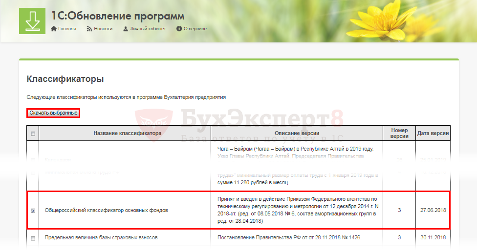 В таблице установите галочку напротив классификатора ОКОФ и нажмите кнопку Скачать выбранные.