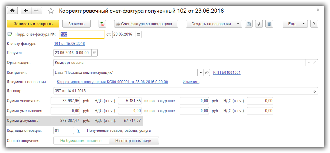 После проведения документа корректировки, зарегистрируем корректировочный счет-фактуру: