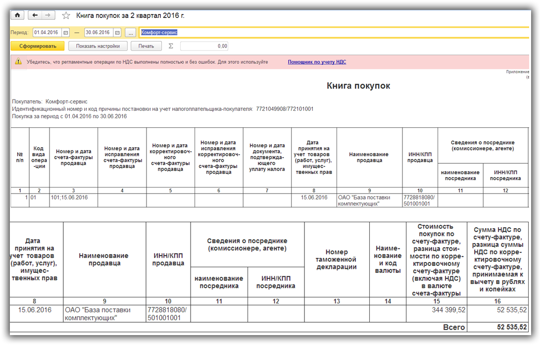 - Произвести проверку правильности отражения НДС, принятого к вычету, в книге покупок с НДС по БУ.