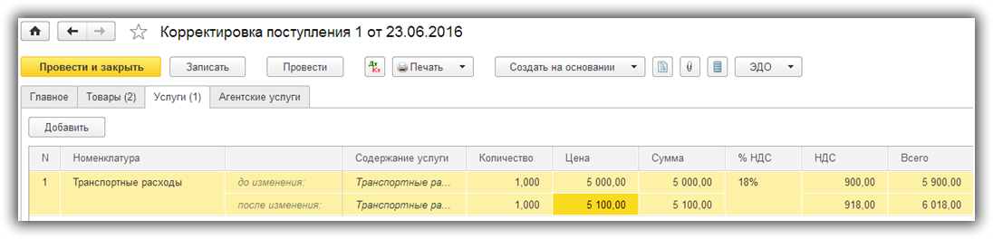 Также, поставщик нам на 100 руб. повысил стоимость транспортных услуг (закладка «Услуги»):