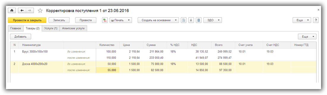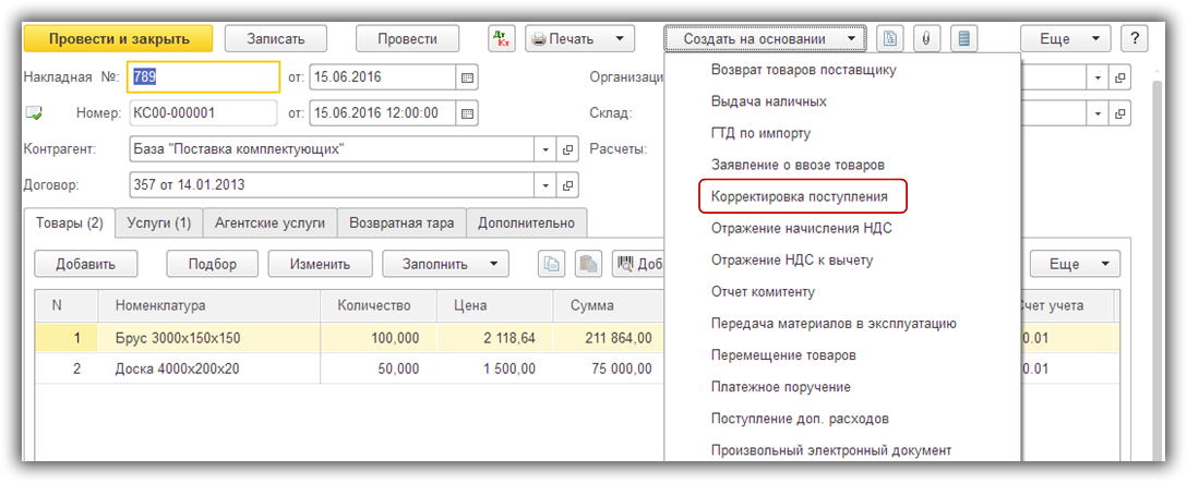 На основании ранее созданного поступления товара, имеется возможность создать документ корректировки. Для этого откроем ранее созданный документ №789 от 15.06.2016