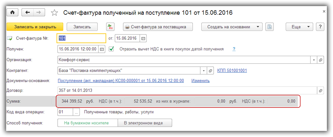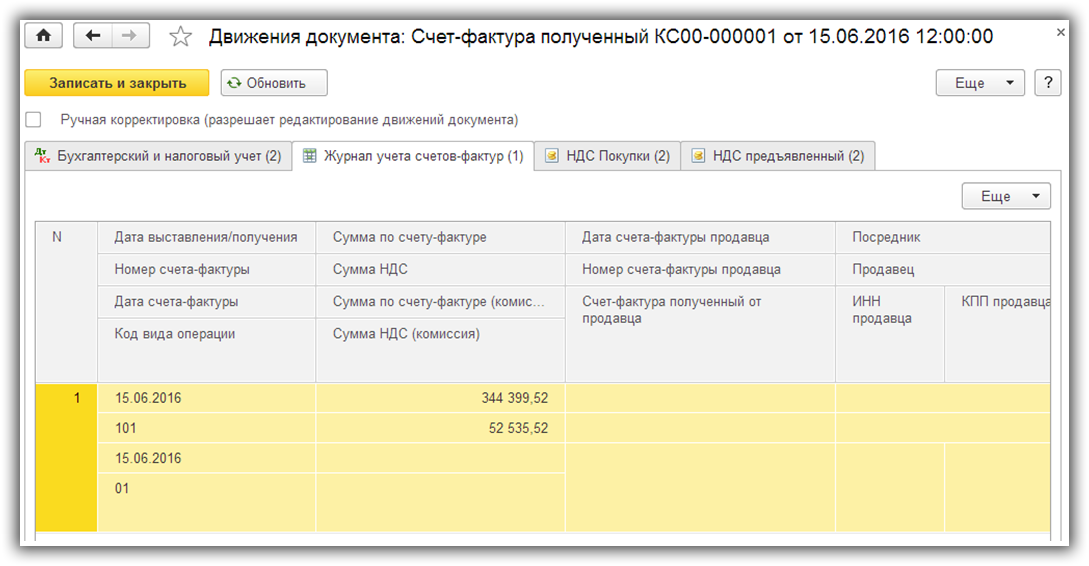 После заполнения документа и простановки галок в строке «Счет-фактура» автоматически появляется ссылка на соответствующий документ «Счет-фактура полученный».