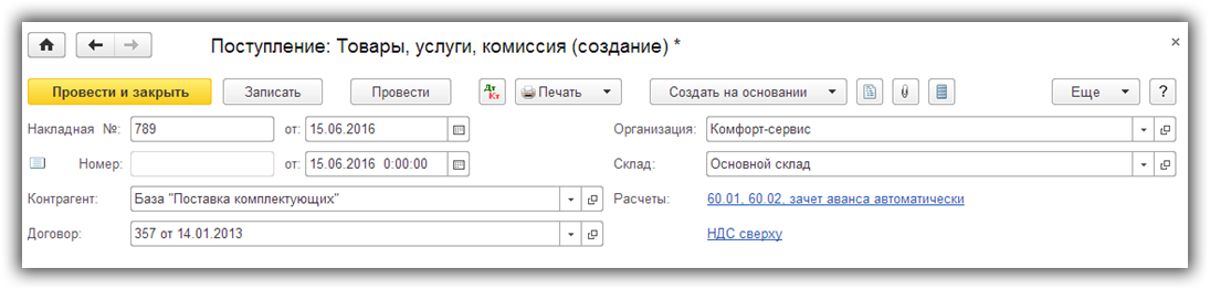 После проведения документа поступления, регистрируем счет-фактуру, аналогично рассмотренному ранее поступлению:
