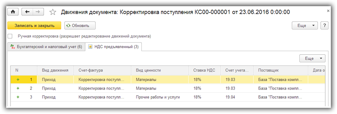 На второй закладке в регистр «НДС Предъявленный»автоматически вносится соответствующая сторнировочная запись. Эта запись нам не нужна, необходимо эту сторнировочную запись удалить (рис. 3).