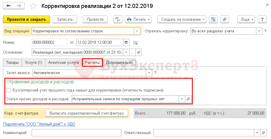 При корректировке сумм прошлого периода проводки напрямую зависят от того, подписана ли бухгалтерская отчетность. Данный факт устанавливается на вкладке Расчеты. Здесь же укажите статью прочих доходов и расходов для учета корректировки в НУ.