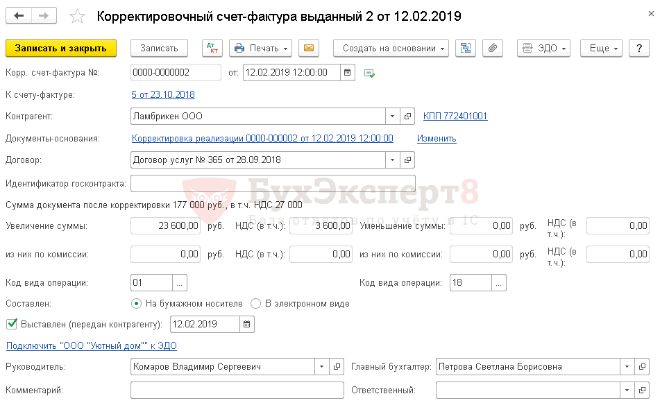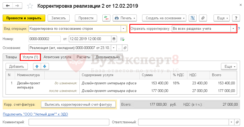 12 февраля по согласованию сторон установлена новая стоимость на оказание услуг от 23 октября. Бухгалтер выставил корректировочный счет-фактуру на сумму 177 000 руб.