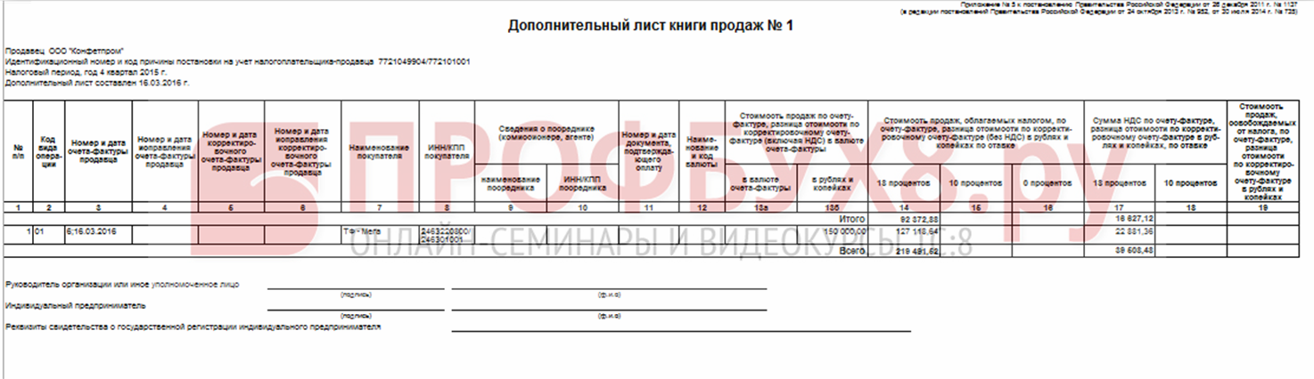 Если имеет место корректировка реализации прошлого периода в сторону уменьшения, то разницу в денежном выражении нужно указать в графе 8 строки Г без отрицательного знака. Документ должен быть подписан уполномоченным лицом. ИП дополнительно следует указать реквизиты свидетельства госрегистрации.