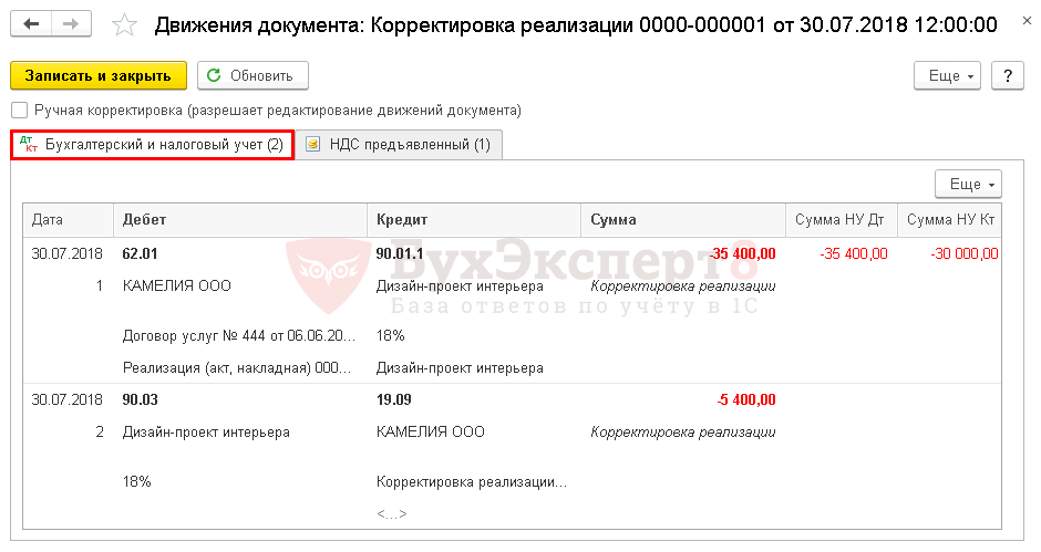 - Отражение корректировки — во всех разделах учета, так как корректируется не только НДС, но и общая сумма реализации.