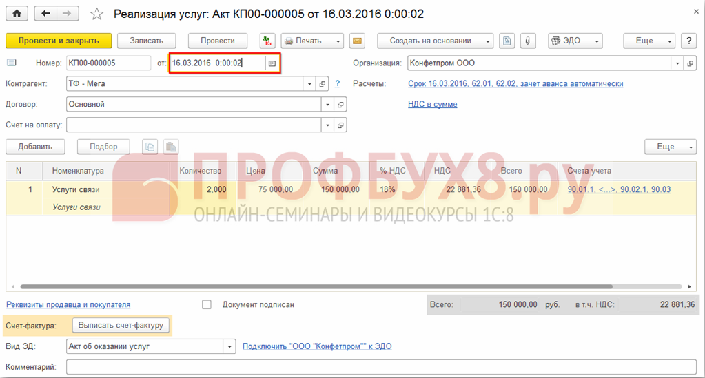 Для отражения забытого документа реализации в 1С 8.3 формируем Реализация (акты, накладные) на дату нахождения ошибки. В нашем случае март, а не декабрь: