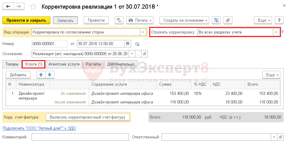 30 июля, по взаимному согласию, разница была компенсирована за услуги, оказанные 26 июля. Бухгалтер внес исправление в счет-фактуру на сумму 118 000 руб.
