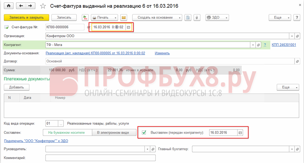 Шаг 2: Вводим счет-фактуру на основании Корректировки реализации. Счет-фактура обеспечивает корректное выполнение последующих шагов и печать исправленного счета — фактуры.