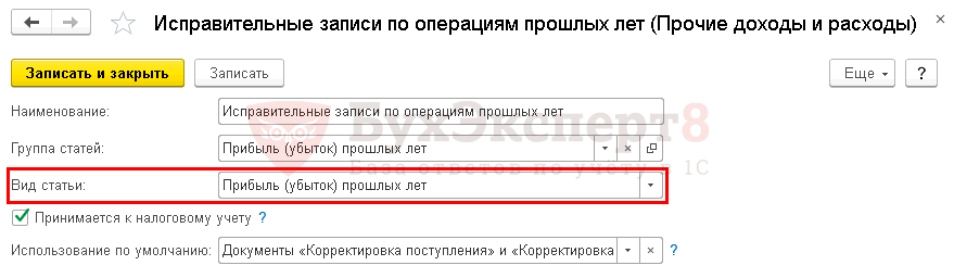 Сумма корректировки при выбранной статье Исправительные записи по операциям прошлых лет отразится в стр. 100 (101) декларации по налогу на прибыль.