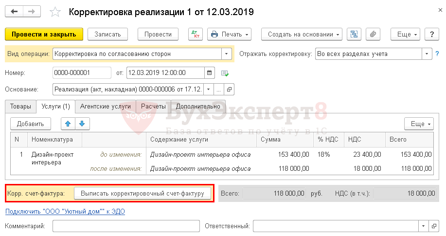 12 марта, в соответствии с соглашением сторон, была произведена корректировка за услуги, оказанные 17 декабря. Бухгалтер выставил корректировочный счет-фактуру на сумму 118 000 рублей.