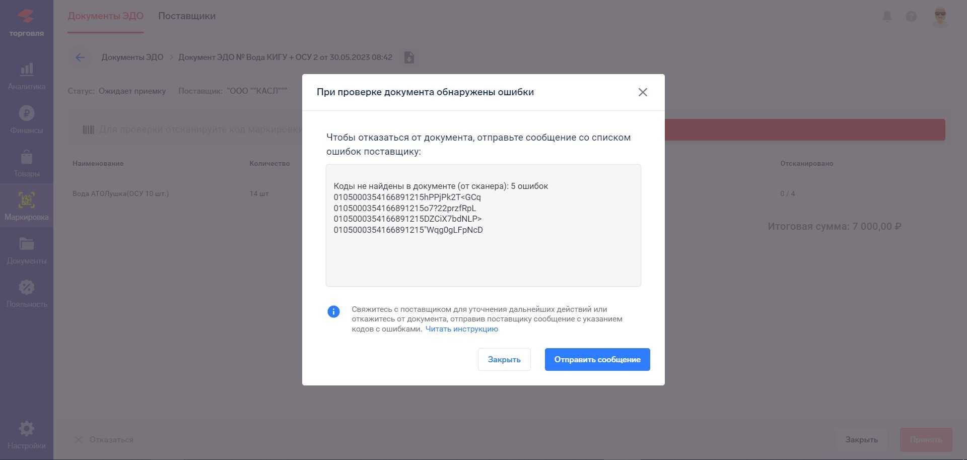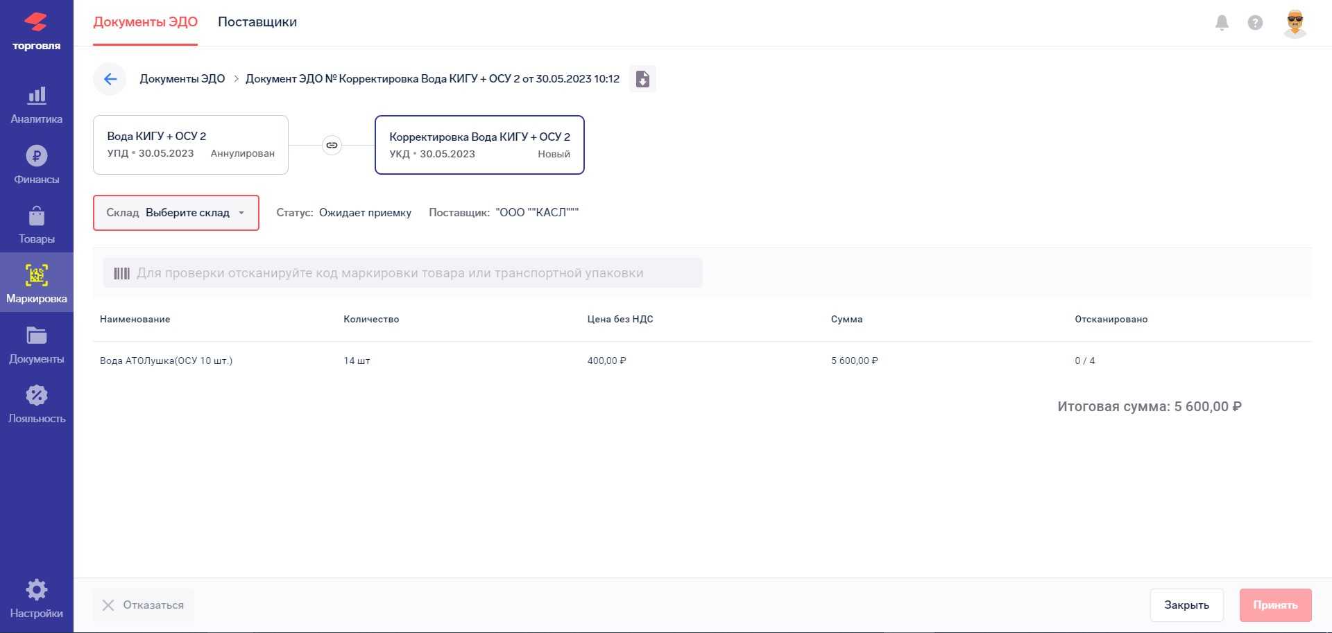 Если коды в накладной отличаются от реальных товаров, магазин отказывает в поставке или принимает только часть продукции. Тогда поставщик исправляет УПД и формирует универсальный корректировочный документ (УКД). В итоге магазин становится собственником товаров в системе «Честный знак» и может их законно продавать.