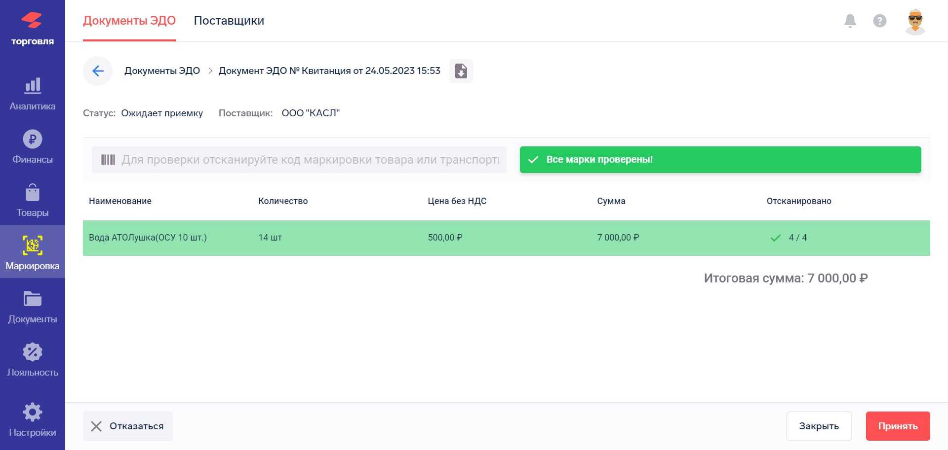 Если отсканирована вся привезённая продукция и ошибок в поставке нет, то система сообщит, что проверены все марки. Нужно выбрать склад, на который осуществляется приёмка, и нажать в документе кнопку “Принять”. Документ будет подписан УКЭП, подпись отправится в систему ЭДО, документ перейдет в статус “Принят — Документооборот завершён”.