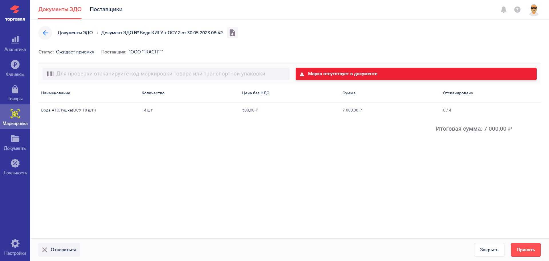2. Если товара нет в документе, вы получите следующее сообщение: «Марка отсутствует в документе».